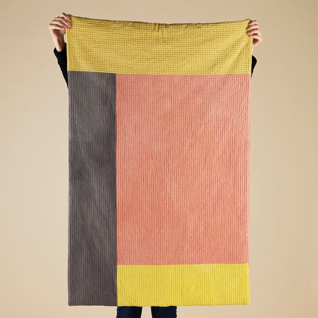 Il a été réalisé en patchwork avec un duo de textiles texturés : un nid d'abeille en coton et une bourrette de soie. Chaque couleur a été réalisée en teinture végétale par nos soins. Chaque modèle est unique.